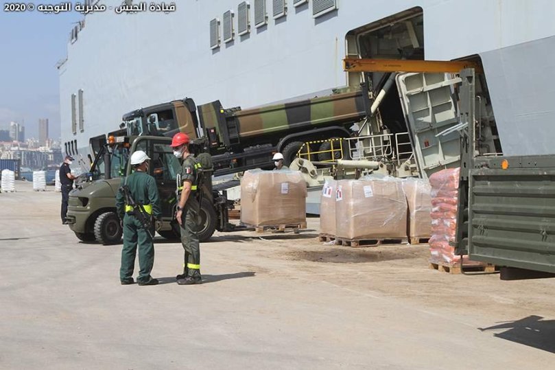 وبحسب بيان لقيادة الجيش مديرية التوجيه، فإنّ حاملة الطوافات المذكورة محمّلة أيضاً بمواد طبية وغذائية ومواد بناء وآليتين مخصصتين كهبة للدفاع المدني، وذلك من ضمن المساعدات التي ترسلها الدول الشقيقة والصديقة إلى لبنان بعد الانفجار الكارثي الذي وقع في المرفأ.