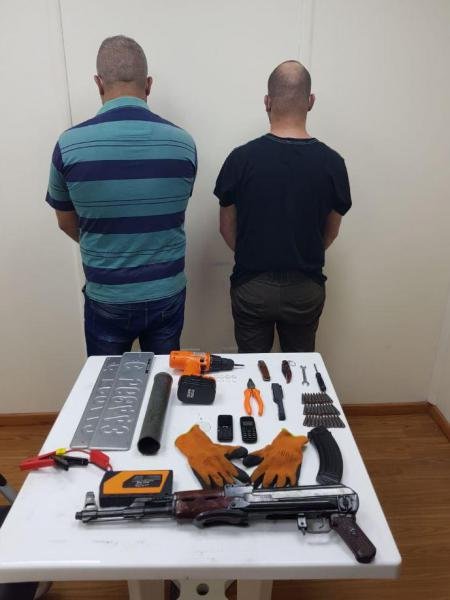 بتفتيشهما والسيارتَين، عُثر على: بندقية كلاشينكوف مع ممشط، سكين، وأدوات تُستخدم لسرقة السيارات(عُدَّة).