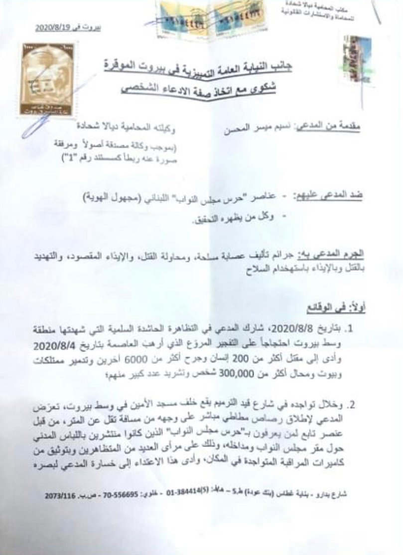 تقدّم نسيم ميسر محسن بشكوى ضدّ عناصر حرس مجلس النواب بجرم تأليف عصابة مسلحة ومحاولة القتل والايذاء المقصود والتهديد بالقتل باستخدام السلاح.