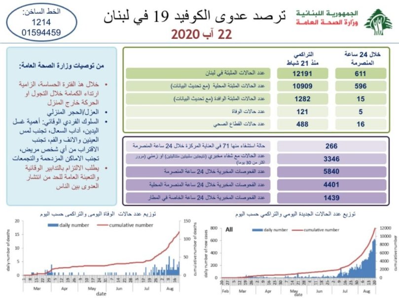 أعلنت وزارة الصحة “تسجيل 611 إصابة جديدة بكورونا و5 حالات وفاة، ليرتفع العدد التراكمي إلى 12191”.