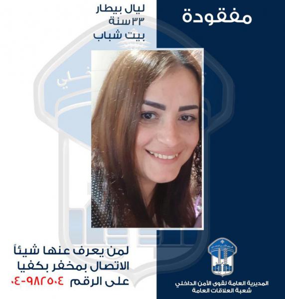 عمّمت المديرية العامة لقوى الأمن الداخلي، بناءً على إشارة القضاء المختص، صورة المواطنة ليال جرجس بيطار (مواليد 1987) التي غادرت بتاريخ 27-8-2020 منزلها الكائن في محلة بيت شباب، ولم تعُد لغاية تاريخه.