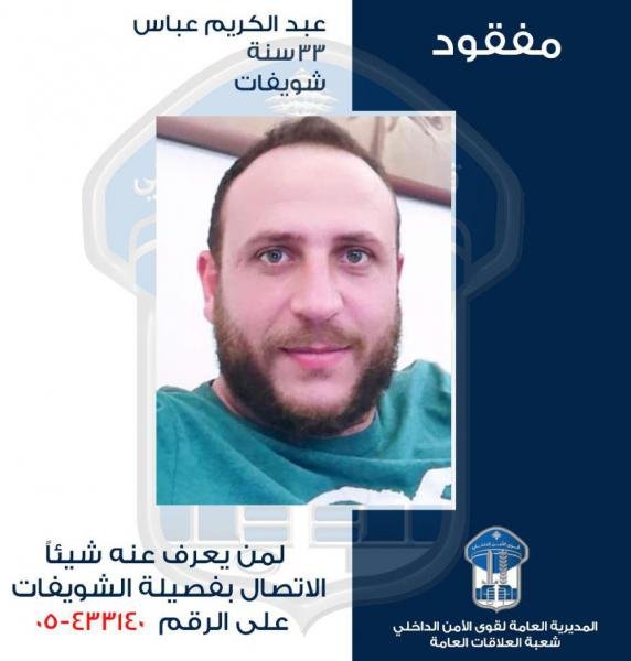 عمّمت المديرية العامة لقوى الأمن الداخلي، بناءً على إشارة القضاء المختص، صورة المفقود: عبد الكريم إبراهيم عباس (مواليد عام 1987، لبناني)”.