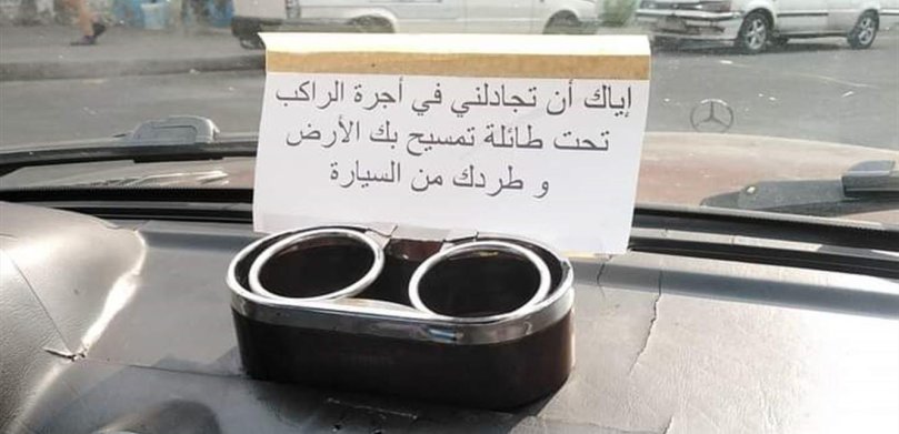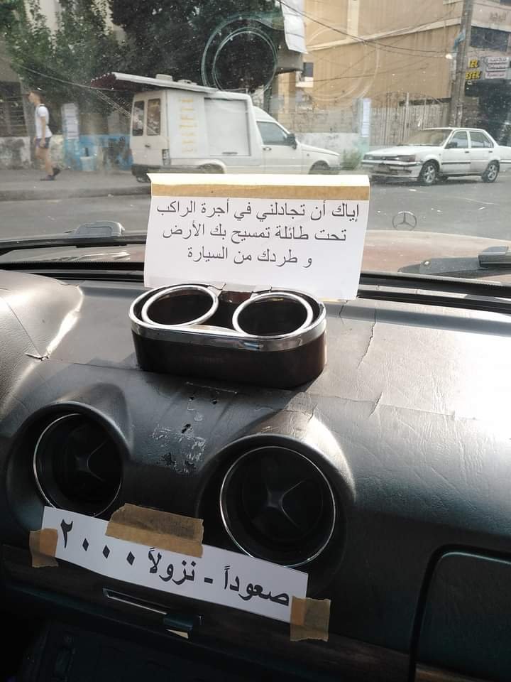 انتشرت صورة على وسائل التواصل لسيارة أجرة حدّد سائقها تسعيرة الراكب بـ 2000 ليرة صعوداً ونزورلاً، ووضع على مقدّمة السيارة عبارة: “إياك أن تجادلني في أجرة الراكب تحت طائلة تمسيح بك الأرض وطردك من السيارة”.