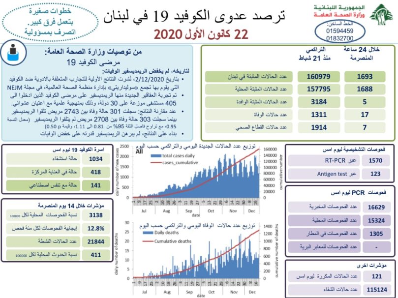 أعلنت وزارة الصحة العامة تسجيل 1693 إصابة جديدة بكورونا، رفعت إجمالي الحالات المثبتة إلى 16979.