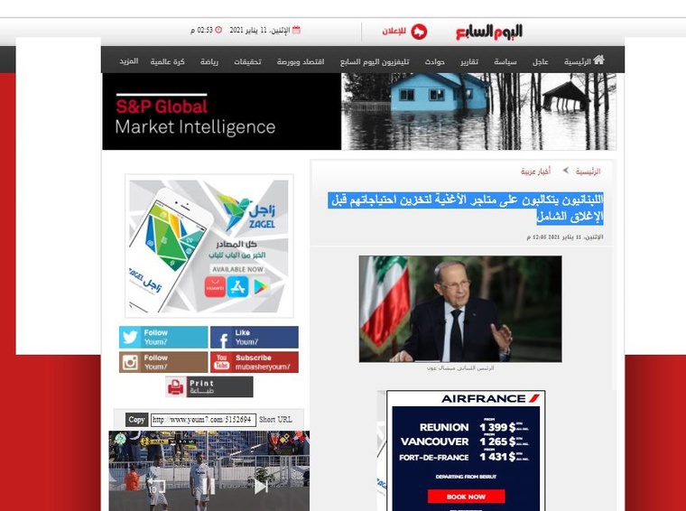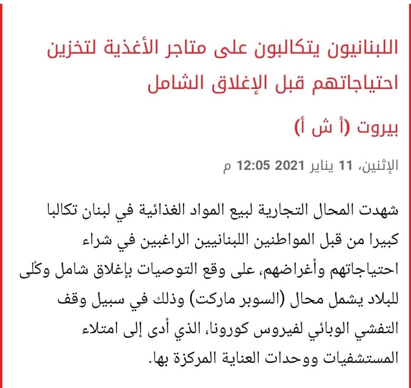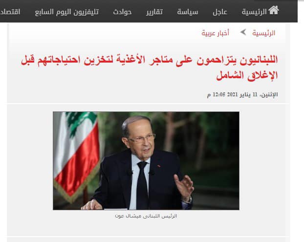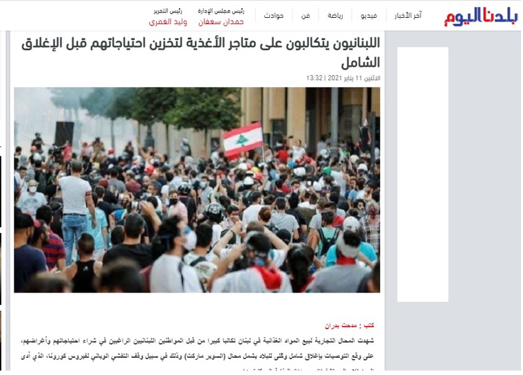 خوف اللبنانيين من عدم توافر المواد التي تتناقص يوما بعد يوم، خرجوا لتأمين حاجاتهم الغذائية قبل أيام الإقفال المقبلة. هذا الموضوع شكل حالة تجاذب على مواقع التواصل الاجتماعي بين مبرر للفعل ومعترض عليه ما شكل “غنيمة” لدى بعض الوسائل الإعلامية العربية التي وصفت فعل التهافت على المواد الغذائية بالـ “التكالب”، إذ نقل موقع “اليوم السابع” تقرير وكالة “أنباء الشرق الأوسط” (وكالة الأنباء المصرية الرسمية) الصادر من بيروت والتي وضعت العنوان التالي للخبر: “اللبنانيون يتكالبون على متاجر الأغذية لتخزين احتياجاتهم قبل الإغلاق الشامل”، وهو ما رأت فيه وسائل إعلامية أخرى تناقلت الخبر على قاعدة “القص واللصق” فعل “التكالب” مادة دسمة لزيادة نسبة متابعة التقرير لنرى في مضمونه سردا لتهافت اللبنانيين على شراء المواد الغذائية، بالإضافة إلى ذكر التدابير التي تقوم بها الحكومة اللبنانية لتدارك أزمة إرتفاع عدّاد اصابات كورونا.