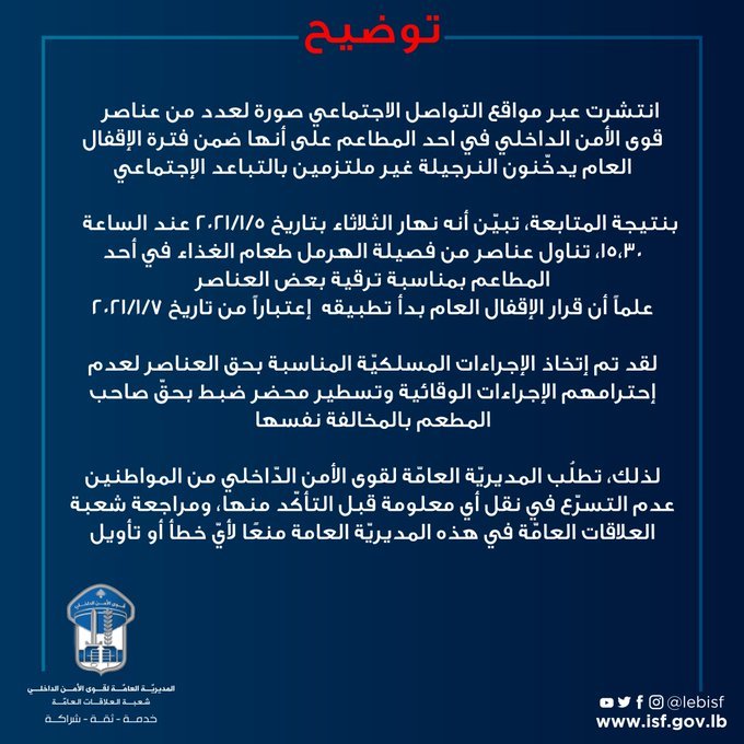 انتشرت عبر مواقع التوصل الاجتماعي صورة تظهر عناصر قوى الأمن الداخلي في أحد المطاعم من دون اتخاذ أدنى إجراءات الوقاية من فيروس كورونا، فلا كمامات بل يجلس العناصر إلى جانب بعضهم البعض، يشربون النرجيلة.