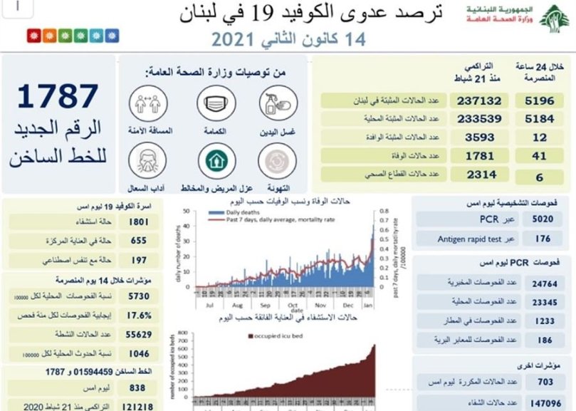 أعلنت وزارة الصحة عن تسجيل 5196 اصابة جديدة بكورونا و41 حالة وفاة.