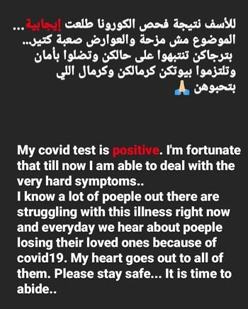 أعلنت الفنانة اللبنانية عبير نعمة إصابتها بفيروس كورونا، وحذرت متابعيها من خطورته والألم الذي يشعر به المريض الذي يحمل هذا الفيروس، كما وطلبت منهم الإنتباه بشكل كبير والبقاء في بيوتهم بأمان، وكتبت عبير في صفحتها الخاصة على موقع التواصل الإجتماعي قائلةً: “للأسف نتيجة فحص الكورونا طلعت إيجابية.. الموضوع مش مزحة والعوارض صعبة كتير.. بترجاكن تنتبهوا على حالكن وتضلوا بأمان وتلتزموا بيوتكن كرمالكن وكرمال اللي بتحبوهن..”.