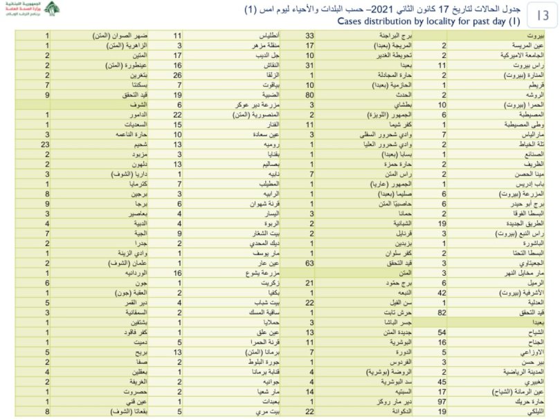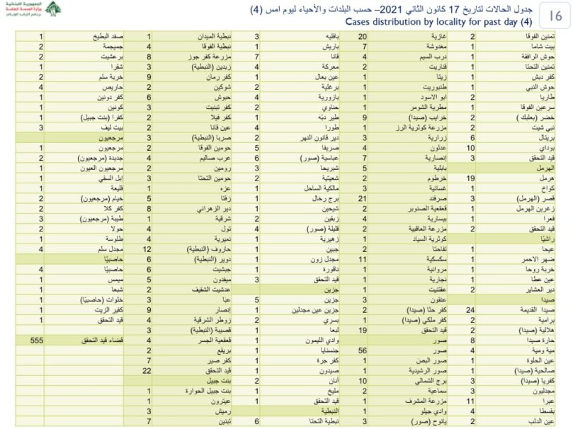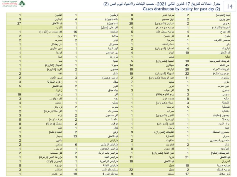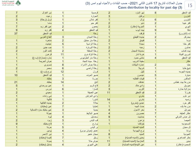 أعلنت وزارة الصحة العامة تسجيل 3654 اصابة جديدة بكورونا و40 حالة وفاة خلال الساعات الـ24 الماضية، توزعت بحسب المناطق والبلدات على الشكل التالي: