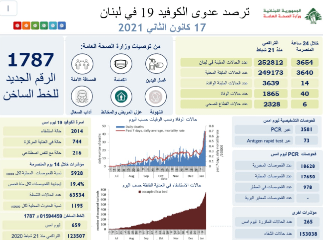 أفادت وزارة الصحة عن تسجيل 3654 حالة بفيروس كورونا اليوم و40 حالة وفاة.