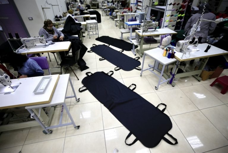 تنهمك العاملات، في “مشغل الأم” في صيدا، بخياطة أكياس الموتى المخصصة لضحايا كورونا بالتزامن مع تزايد عدد الوفيات اليومية من جرّاء تفشّي الفيروس.