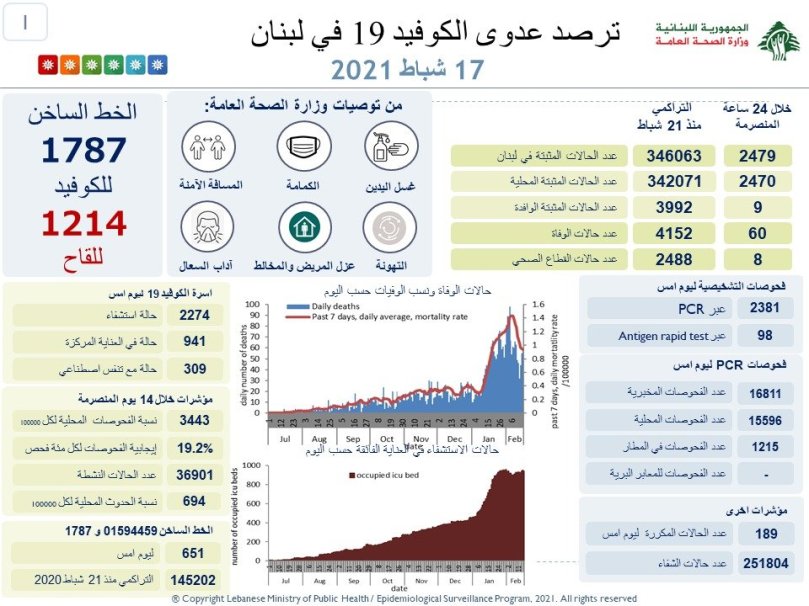 كما وسجل لبنان 60 حالة وفاة ما رفع العدد التراكمي للوفيات منذ بدء انتشار الوباء في شباط الفائت إلى 4152.