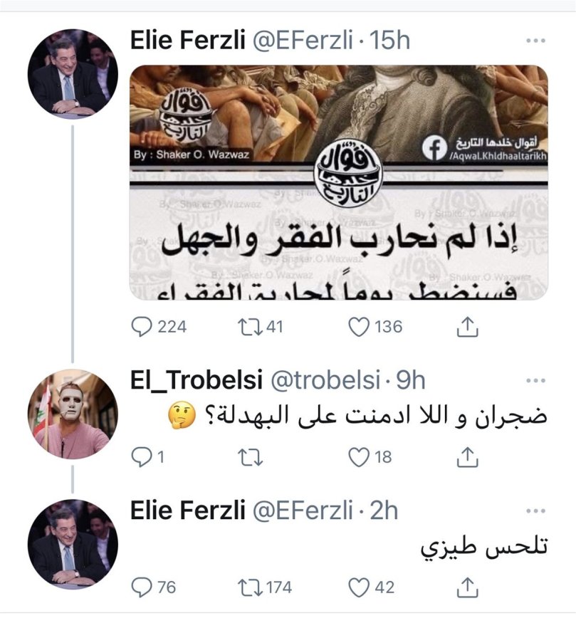 في معرض رده على احد التعليقات على ما نشره على “تويتر” يوم امس، استخدم نائب رئيس مجلس النواب ايلي الفرزلي للرد على المعلق تعبير “تلحس طيزي”، لكنه عاد وحذفها بعد بعض الوقت.