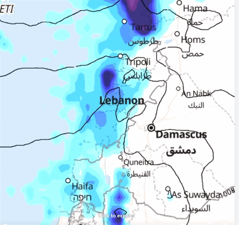 تتساقط امطار طوفانية ساحلاً ويصل مستوى تدني الثلوج يوم الجمعة الى 1100/1200 وتكون التركمات ملحوظة فوق 1500 متر.