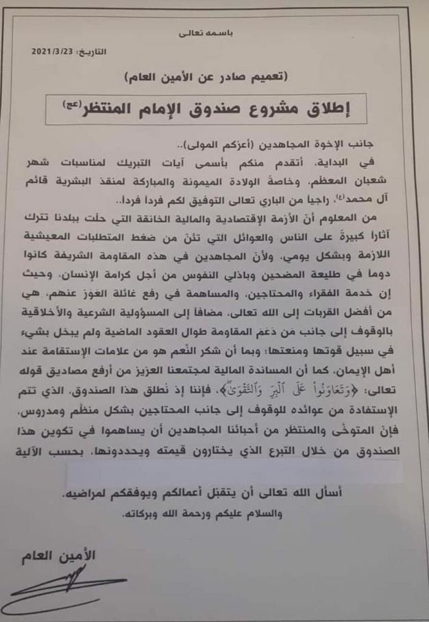 وأضاف التعميم, “من المعلوم أن الأزمة الاقتصادية والمالية الخانقة التي حلت ببلدنا تترك آثاراً كبيرة على الناس والعوائل التي تئن من ضغط المتطلبات المعيشية اللازمة وبشكل يومي، ولأن المجاهدين في هذه المقاومة الشريفة كانوا دوما في طليعة المضحين وباذلي النفوس من أجل كرامة الإنسان”.