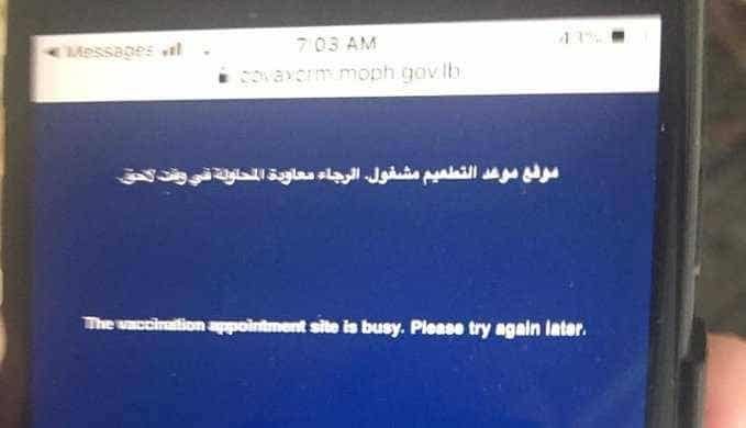 ومع أنّ حلحلة نسبية حصلت الاثنين على المنصة، فإنّ عملية تسجيل طلب تحديد الموعد تصطدم منذ الأحد بصورة تقول إنّ الموقع مشغول ويطلب معاودة المحاولة لاحقاً كما تبيَّن من الصورة المرفقة.