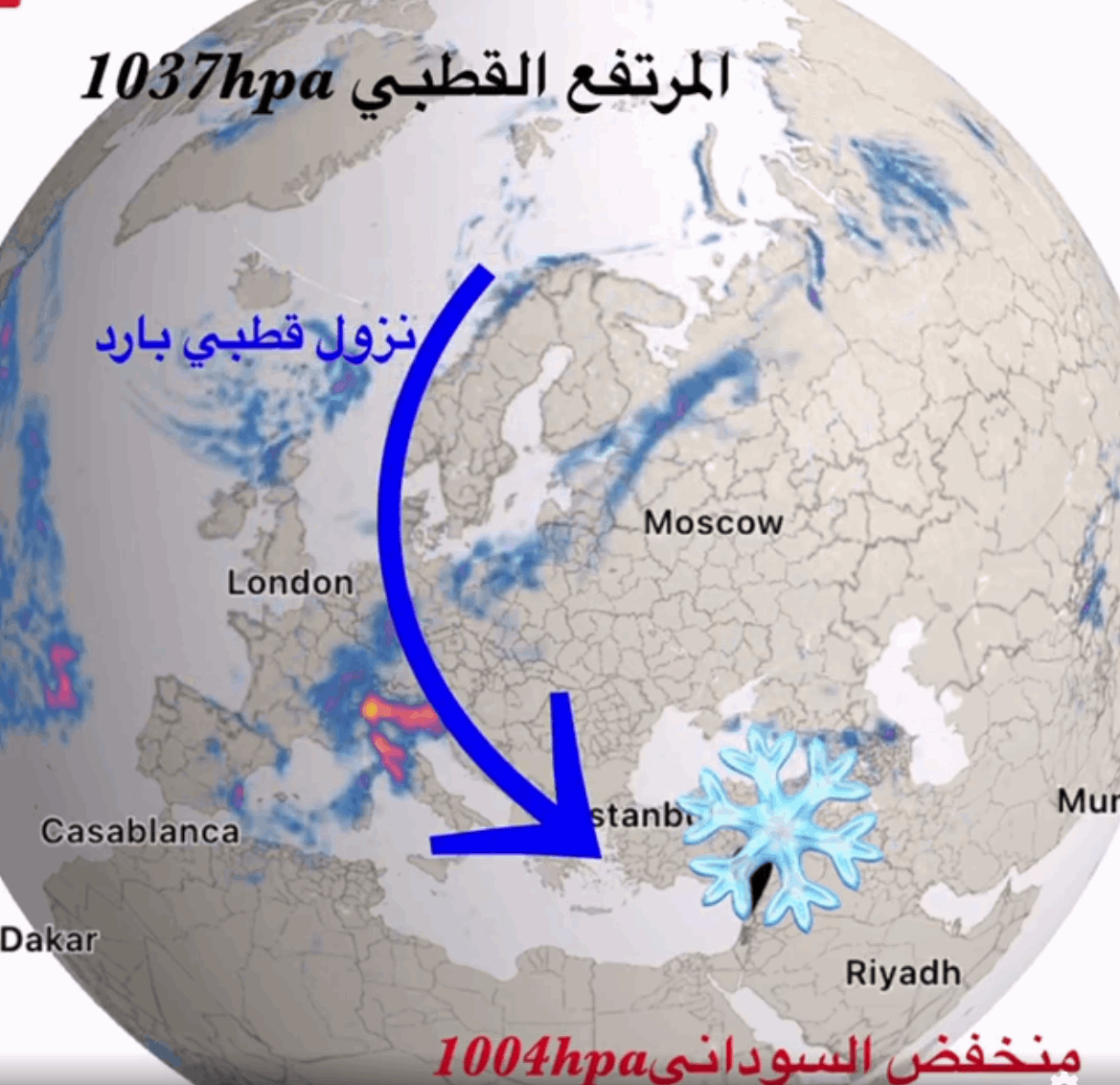 ملاحظة: ينحسر نشاط المرتفع الجوّي الشبه مداري عن المنطقة يوم الاربعاء، ويتمدّد المنخفض السوداني من السودان وبحر الاحمر نحو لبنان والاردن وسوريا فتتراجع قيم الضغط الجوي نحو 1004hpa الأمر الذي سيستقطب الرياح القطبية نحو سيناء يومي الجمعة والسبت فتكون الأجواء عاصفة وممطرة ومثلجة