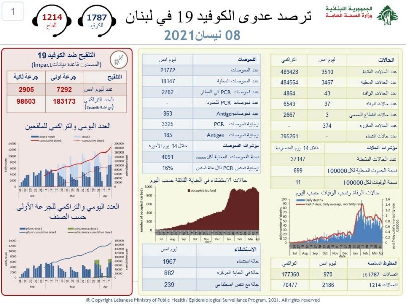 أعلنت وزارة الصحة العامّة في تقريرها اليومي حول مستجدات فيروس كورونا اليوم الخميس, عن “تسجيل 3510 إصابة جديدة بكورونا ( 3467 محلية و43 وافدة) ليصبح العدد الإجمالي للإصابات 489428”.