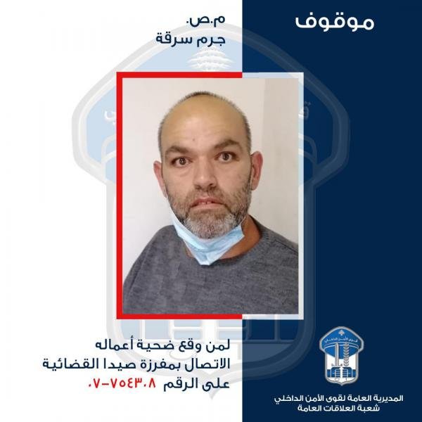 لذلك، تُعمّم المديرية العامة لقوى الأمن الداخلي صورته بناءً على إشارة القضاء المختص، وتطلب من الذين وقعوا ضحية أعماله، الحضور إلى مركز مفرزة صيدا القضائية في وحدة الشرطة القضائية في تلّة مار الياس – حارة صيدا، أو الاتصال على أحد الرقمّين: 754308/07 ــــــ 754309/07، تمهيداً لاتخاذ الإجراءات القانونية اللازمة.