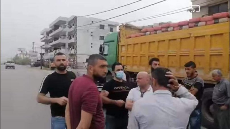 تجمع عدد من تجار وعمال البناء على “اتوستراد المنية” لمنع مرور الشاحنات المحملة بالأسمنت.