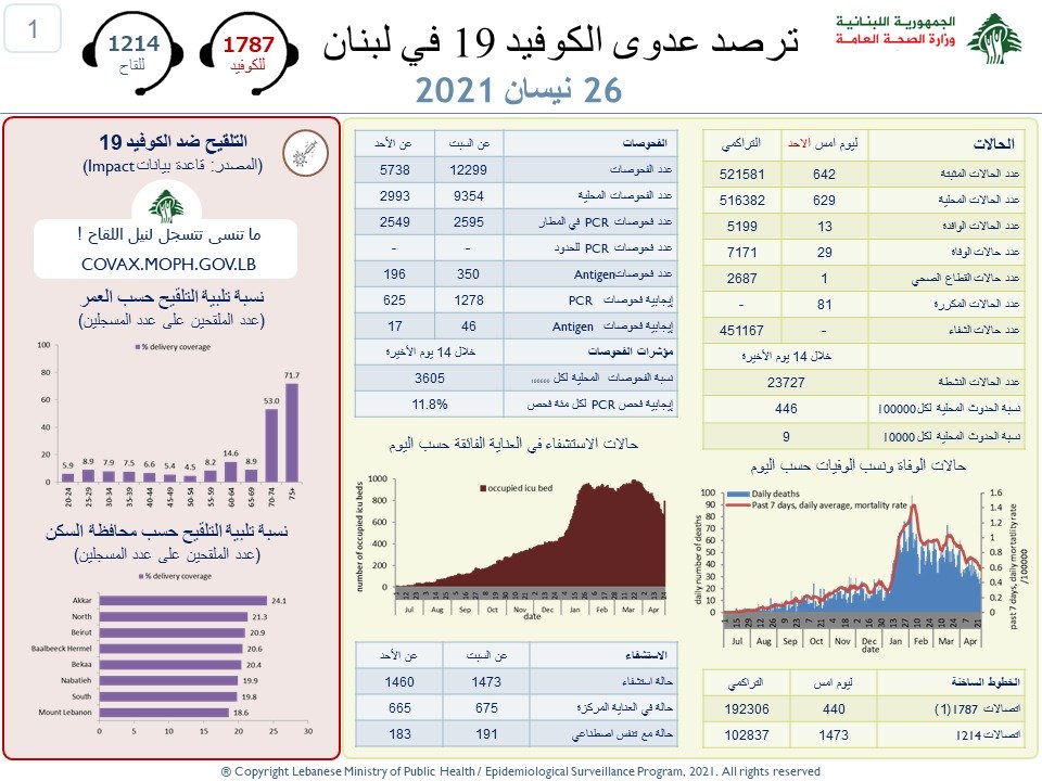 أعلنت وزارة الصحة العامة تسجيل 642 إصابة جديدة بفيروس “كورونا” في لبنان، ما يرفع العدد الإجمالي للمصابين إلى 521581.