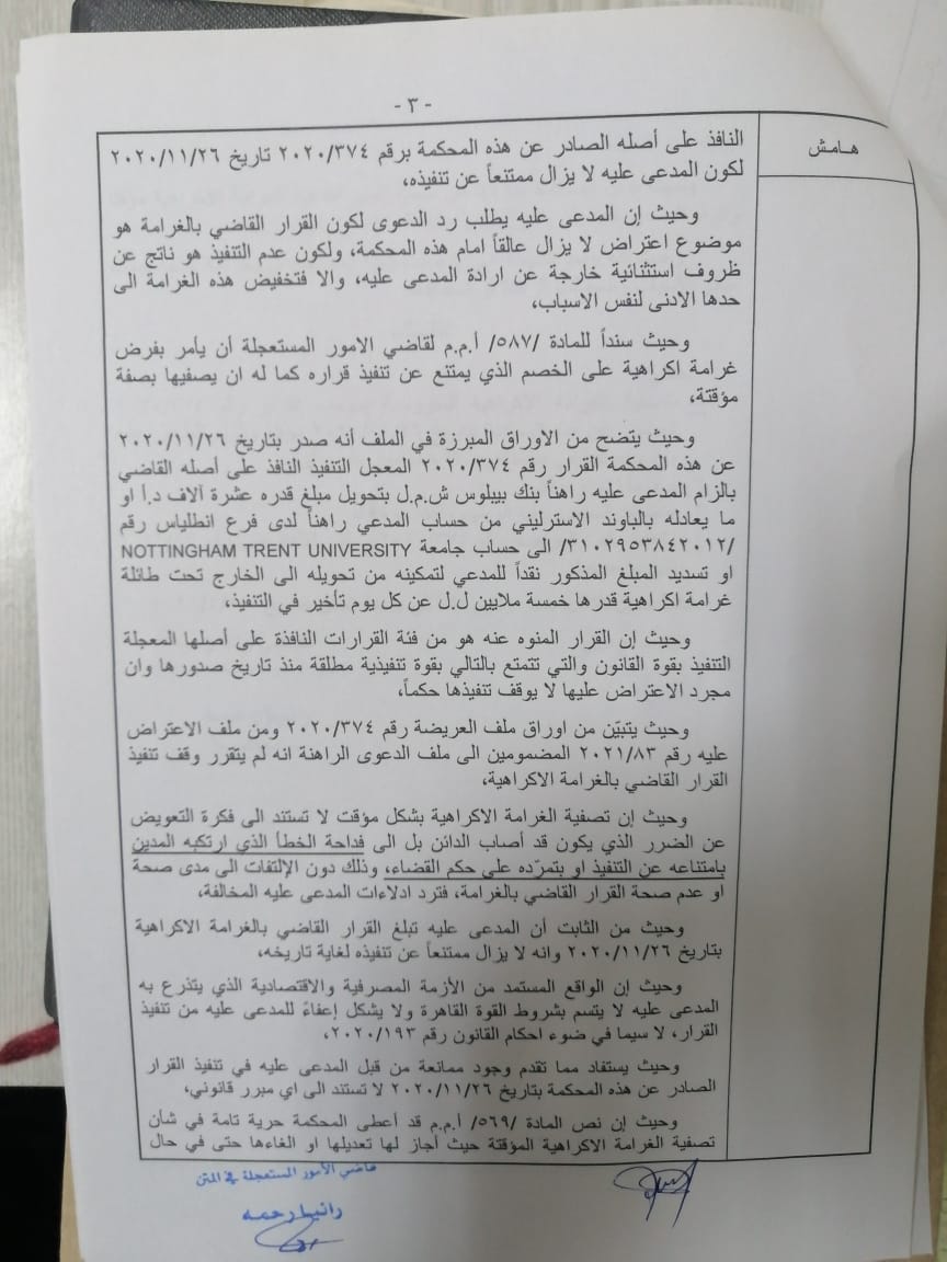في أول قرار يصدر عن القضاء اللبناني، قضت قاضية العجلة في المتن الرئيسة رانيا رحمة بموجب قرارها رقم ٢٠٢١/١٠٤ تاريخ ٢٠٢١/٤/٢٨ بإلزام بنك بيبلوس في الدعوى المقدمة ضده من نصار بو هدير بوكالة المحامي جهاد بو نادر بغرامة اكراهية قدرها مائتي مليون ليرة لبنانية لتمنعه عن تنفيذ حكمها بتحويل الرسوم الجامعية الى الخارج لابن السيد بو هدير.