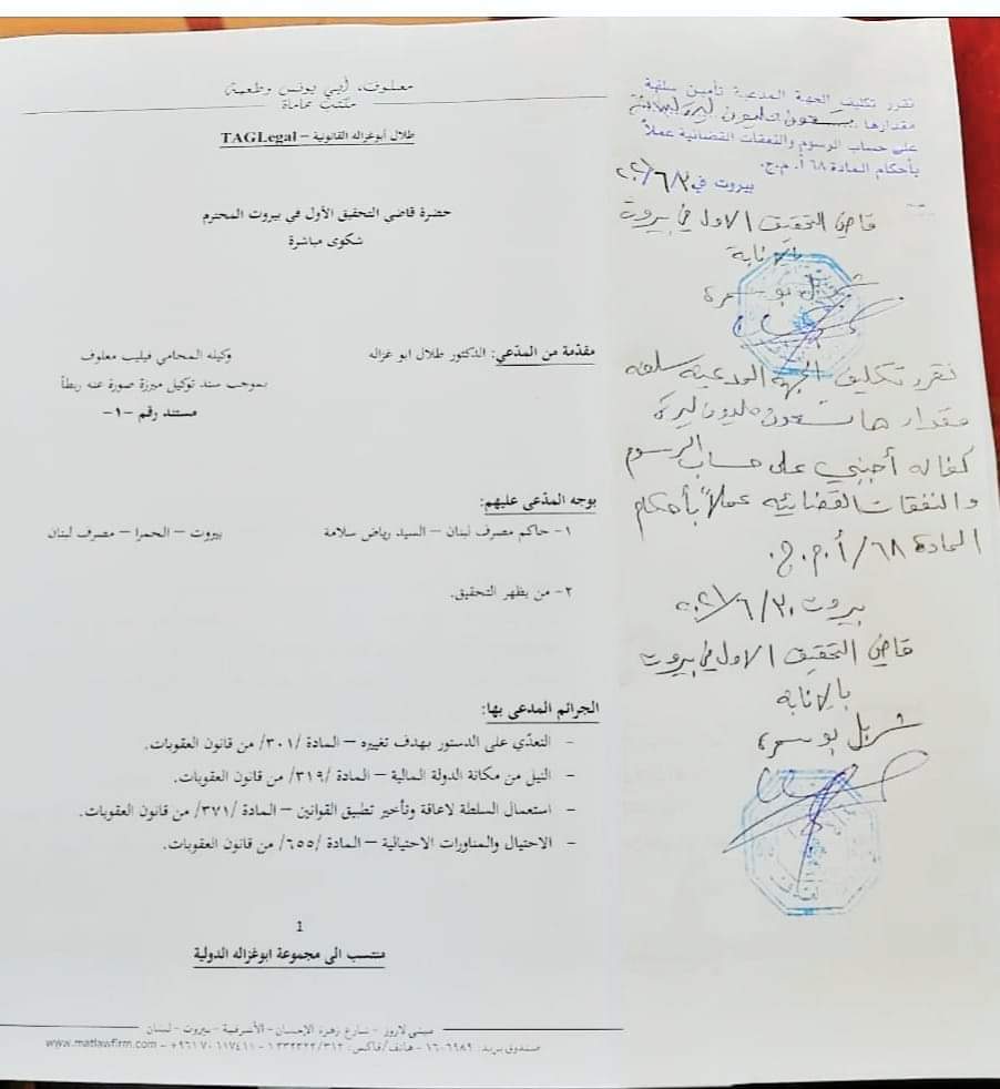 تقدم الدكتور طلال ابو غزالة اليوم الأربعاء، شكوى ضد حاكم مصرف لبنان رياض سلامة بجرائم عدة وهي؛ التعدي على الدستور، النيل من مكانة الدولة، استعمال السلطة لإعاقة وتأخير تطبيق القوانين، الاحتيال والمناورات الاحتيالية.