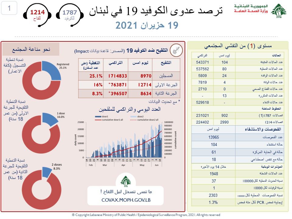 أعلنت وزارة الصحة العامة في تقريرها اليومي تسجيل 104 إصابة جديدة بفيروس كورونا رفعت العدد التراكمي للحالات المثبتة الى 543371.