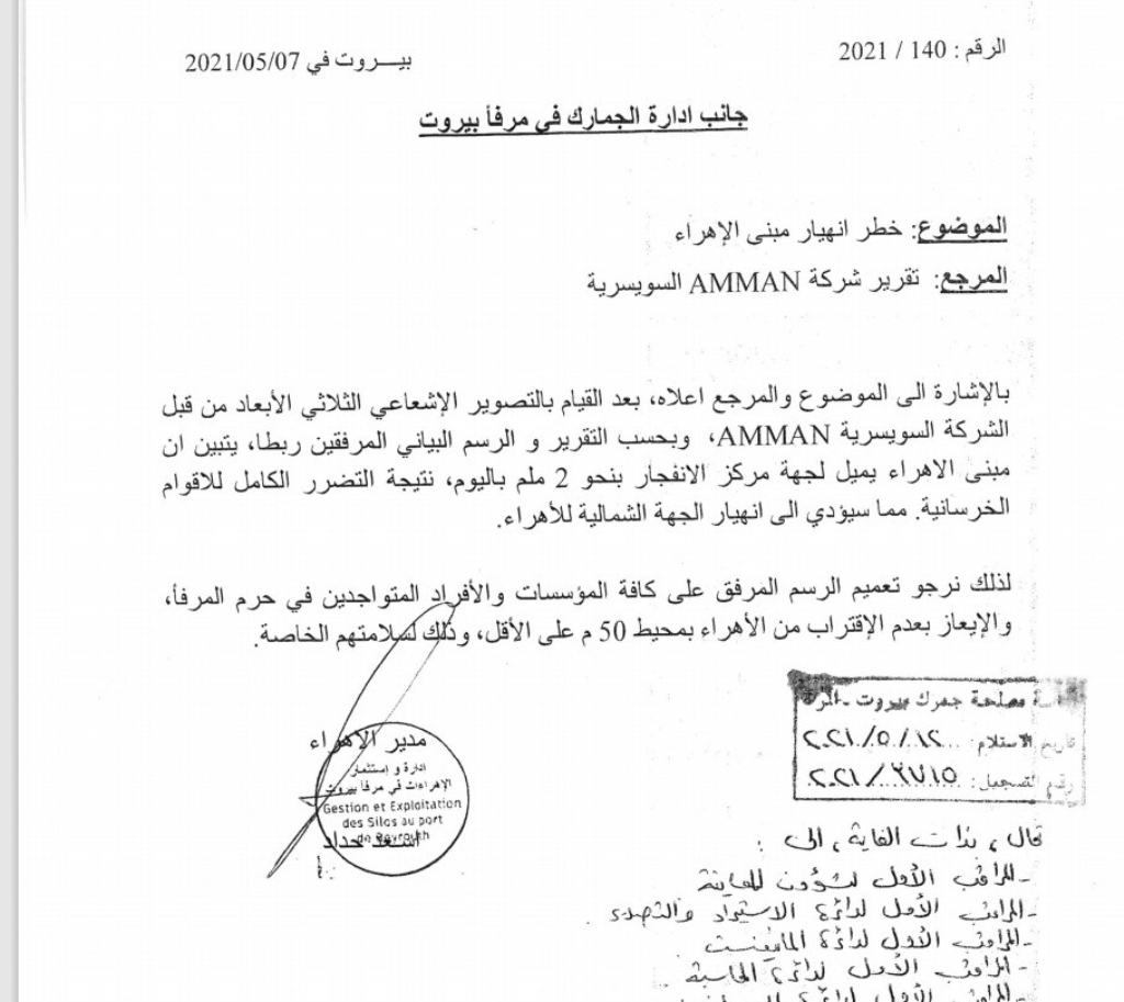 في تقرير حصلت عليه «الأخبار»، وجّهت شركة «AMMAN» السويسرية، إلى مديرية الجمارك، كتاباً حول «خطر انهيار مبنى الأَهراء»، مؤرّخاً في 7 أيار الماضي. وبحسب التقرير، فإن الشركة، و«بعد القيام بالتصوير الإشعاعي الثلاثي الأبعاد، تبيّن أن مبنى الأَهراء يميل لجهة مركز الانفجار بنحو 2 ملم في اليوم، نتيجة التضرر الكامل للأقوام الخرسانية، ما سيؤدي إلى انهيار الجهة الشمالية للأهراء». وطلب السويسريون من الدولة، «تعميم الرسم الذي يبيّن الميل على كلّ المؤسسات والأفراد المتواجدين في حرم المرفأ، والإيعاز بعدم الاقتراب من الأهراء بمحيط 50 متراً على الأقل، لسلامتهم الخاصة». فماذا فعلت الدولة؟