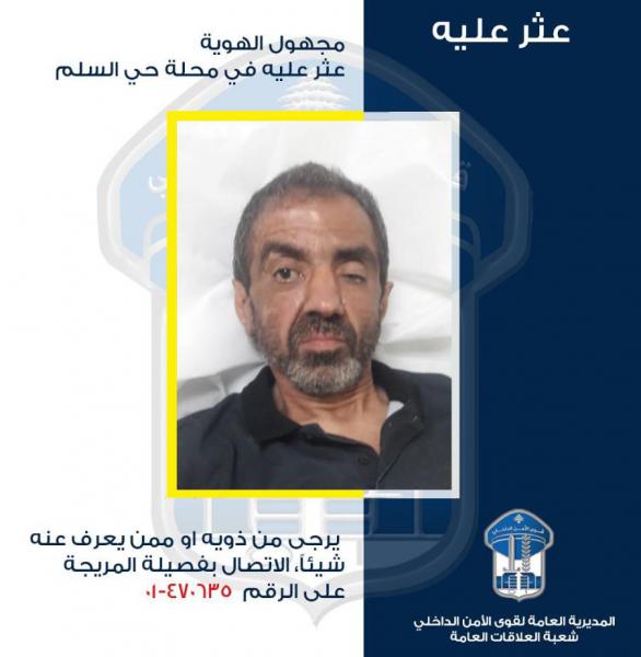 عممت المديرية العامة لقوى الأمن الداخلي، “بناءً على إشارة القضاء المختص، صورة شخص مجهول الهوية عثر عليه بتاريخ اليوم 23-6-2021 في محلة حي السلم، وليس بحوزته أي مستند يعرّف عنه، ولا يمكن التواصل معه، ولا يمكنه تحديد مكان إقامته، كما جرى نقله الى احدى المستشفيات بغية الاطمئنان على وضعه الصحي”.