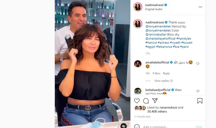 وشاركت الراسي مقطع فيديو في صفحتها بموقع للتواصل الاجتماعي بدت فيه وهي عند مصفف الشعر الذي أنهى فص وصبغ وتسريح شعرها وهي جالسة على الكرسي بحماسة للحصول على الإطلالة الجديدة وعلقت بعد رؤيتها للشكل النهائي لتسريحتها في المرآة: “هيدا شو وكمان غرة!” ، ما أثار حالة من القلق عند مصفف الشعر الذي بدا مذهولا من كلامها وظهر ذلك جليا من خلال تعابير وجهها”، لتدخل نادين في نوبة من الضحك عند رؤية ردة فعله مرددة: “كتير حلوة”.
