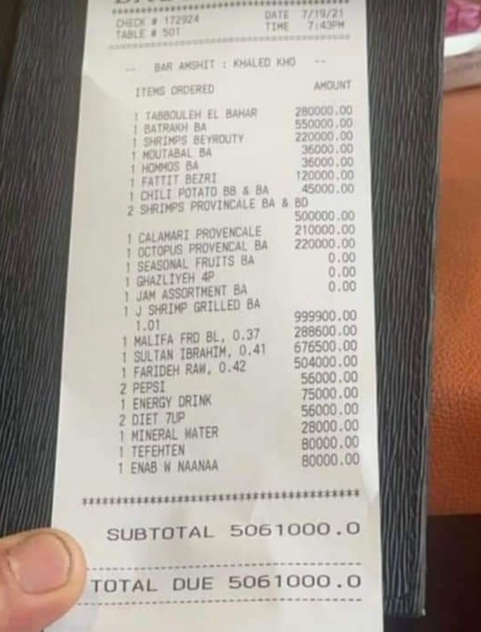 انتشرت عبر مواقع التواصل الاجتماعي صورة لفاتورة من أحد المطاعم اللبنانية، وقد بلغت أكثر من 5 ملايين ليرة، في حين ثمن القريدس المشوي وحده 999 الف ليرة، فيما عبوة المياه بـ28 ألف ليرة.