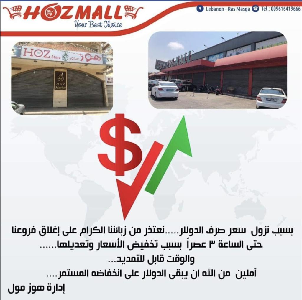 اعلنت عدة مؤسسات لبيع المواد الغذائية من ضمنها “HOZ MALL” انها ستغلق فروعها مؤقتاً حتى الساعة ٣ ظهراً لتعديل وتخفيض الاسعار تزامناً مع انخفاض سعر صرف الدولار في السوق الموازية.