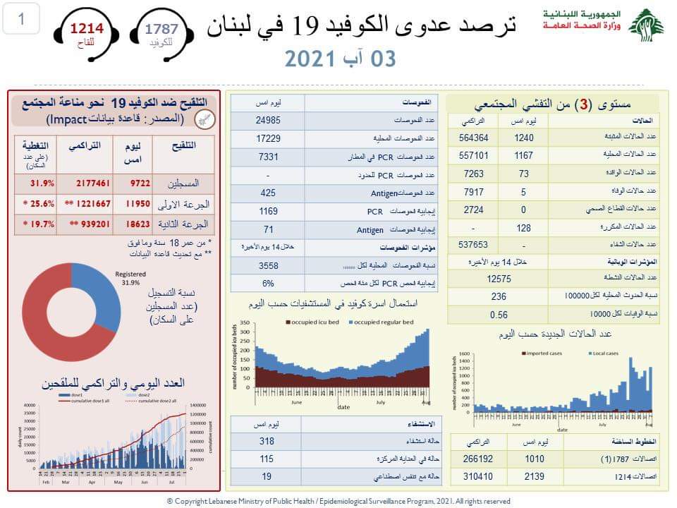 أعلنت وزارة الصحة تسجيل 1240 إصابة جديدة بفيروس كورونا و 5 حالات وفاة خلال الـ 24 ساعة الماضية.