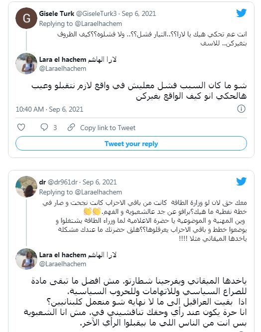 غرّدت الاعلامية السابقة في الـotv وفي الـlbci راهنا لارا الهاشم منتقدة اداء التيار الوطني الحر في وزارة الطاقة.