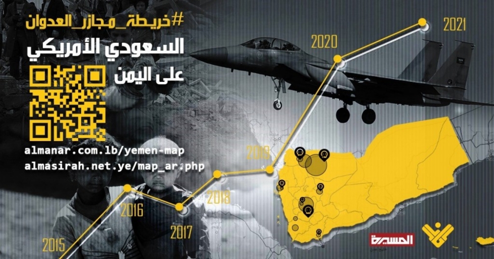 تطلق قناتا المنار والمسيرة مساء اليوم الجمعة أضخمَ عملية توثيق لمجازر العدوان السعودي الأمريكي في اليمن من خلال خريطة تفاعلية توثّق المجازر المرتكبة وتبيّن انتشارها على امتداد اليمن بطريقة مبتكرة تسهّل عملية البحث لكي تشكّل مرجعية للحقوقيين ووسائل الإعلام والصحافيين والمتخصصين والرأي العام.