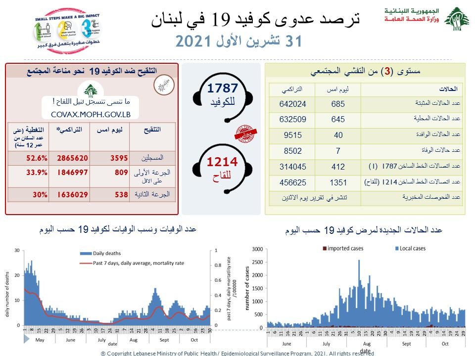 أعلنت وزارة الصحة العامة “تسجيل 685 إصابة جديدة بكورونا في لبنان، إضافة إلى 7 حالات وفاة”.