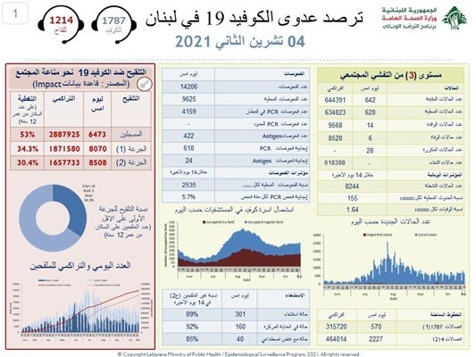 أعلنت وزارة الصحة العامة في تقريرها اليومي تسجيل 642 إصابة جديدة بفيروس كورونا، رفعت العدد التراكمي للحالات المثبتة الى 644391، كما تم تسجيل 6 حالات وفاة.