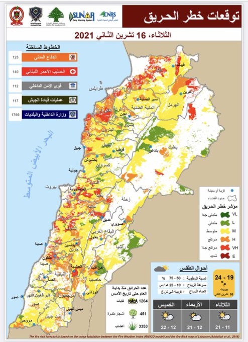 نشر الدفاع المدني نشرة احتمال حرائق الغابات تظهر مدى ارتفاع خطر نشوب الحرائق في بعض المناطق فـ اليكم الخريطة :