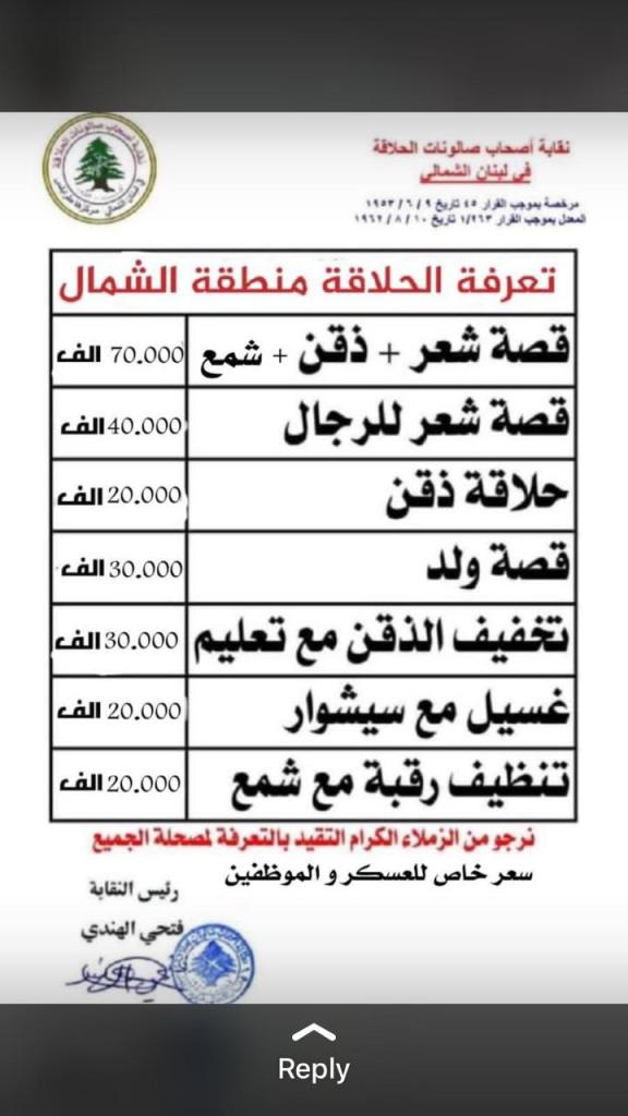 تناقل ناشطون عبر مواقع التواصل الاجتماعي صورة تظهر تعرفة الحلاقة في منطقة الشمال.