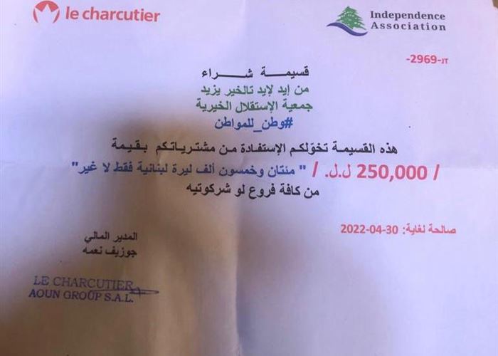 يتم التداول عبر مواقع التواصل الإجتماعي على ان أحد المرشحين عن منطقة الدائرة الأولى في بيروت، بدأ بتوزيع قسيمة شراء على الناخبين بقيمة 250،000 ليرة لبنانية اي ما يعادل الـ١٠ دولار أميركي.