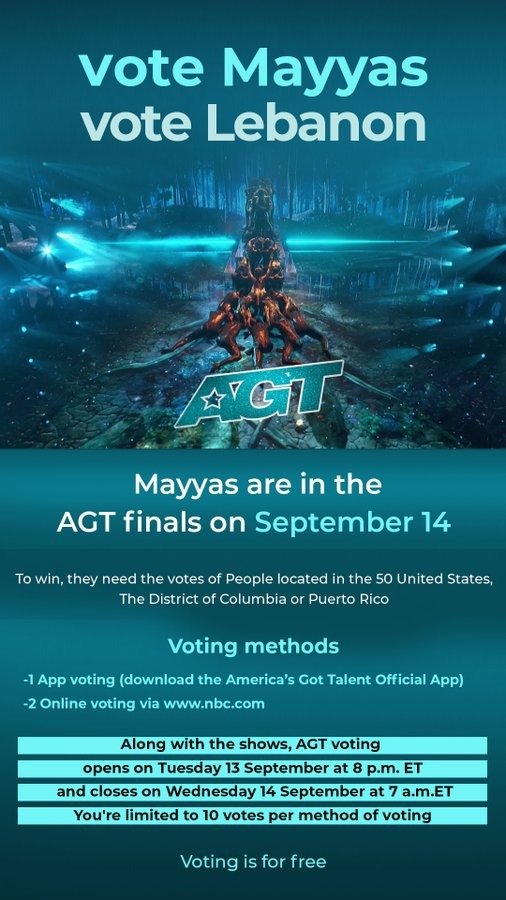 تقدّم فرقة “مياس” اللبنانية عرضها الأخير في الحلقة النهائية من America’s got talent غداً الأربعاء 14 أيلول. ولكي تفوز باللقب، فهي بحاجة الى التصويت الذي يبدأ فجر الأربعاء الساعة 3 بتوقيت بيروت.