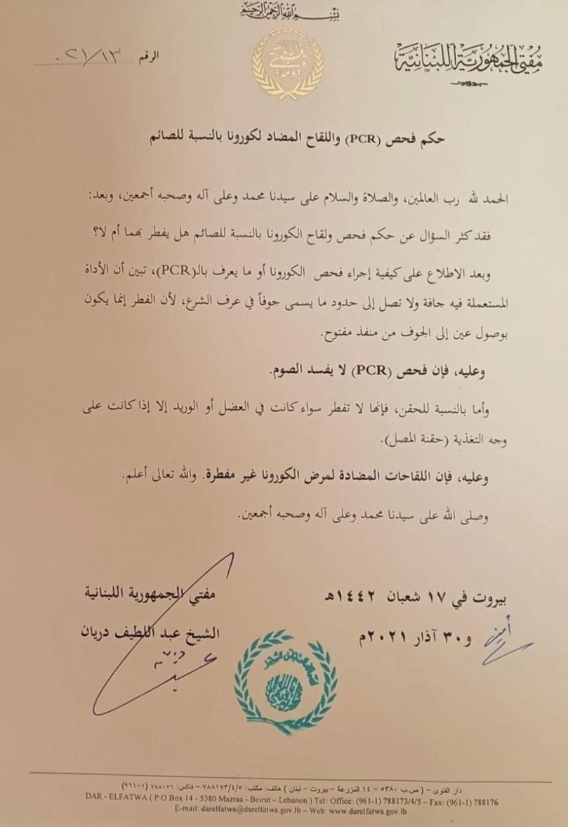 أعلن مفتي الجمهورية اللبنانية الشيخ عبد اللطيف دريان أن فحص pcr واللقاح ضد “كورونا” لا يفسدان الصوم.